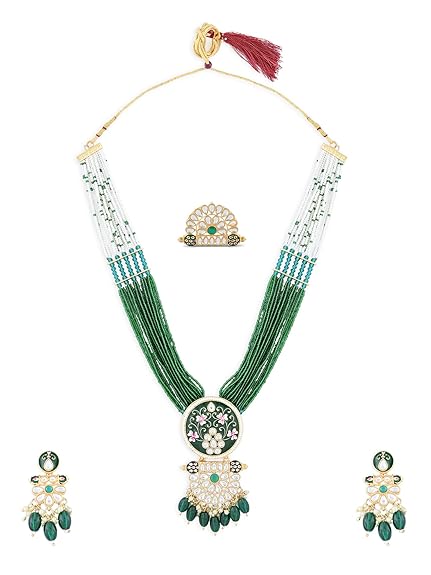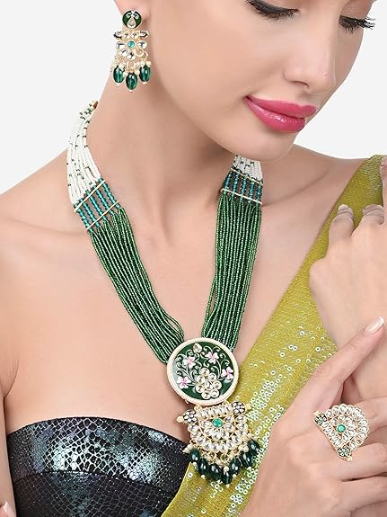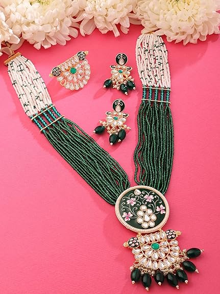 Green Pink Meenakari Multistrand Beaded Long Kundan Necklace Earring & Ring Set For Women-ZPFK15624